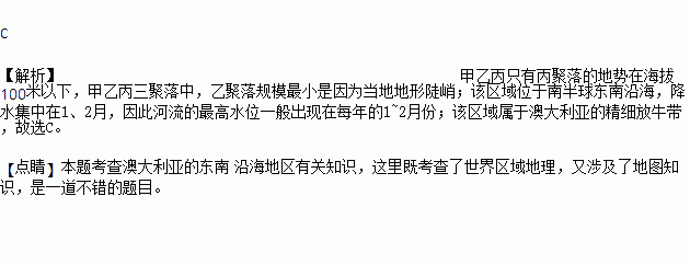下图为澳大利亚东南沿海某局部区域等高线地形图,图中甲、乙、丙表示三个聚落。下列叙述正确的是( )