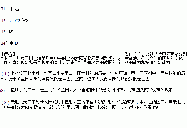 (4)甲、乙两图中,与最近几天中午时分太阳光照情况比较接近的 图,此时地球公转接近至图中字母 所在的位置附近。