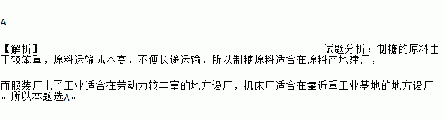 A 【解析】试题分析:制糖的原料由于较笨重,原料运输成本高,不便长途运输,所以制糖原料适合在原料产地建厂, 而服装厂电子工业适合在劳动力较丰富的地方设厂,机床厂适合在靠近重工业基地的地方设厂。所以本题选A。