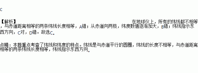 A. 所有纬线的长度都相等 B. 从赤道向两极,纬度数值逐渐缩小