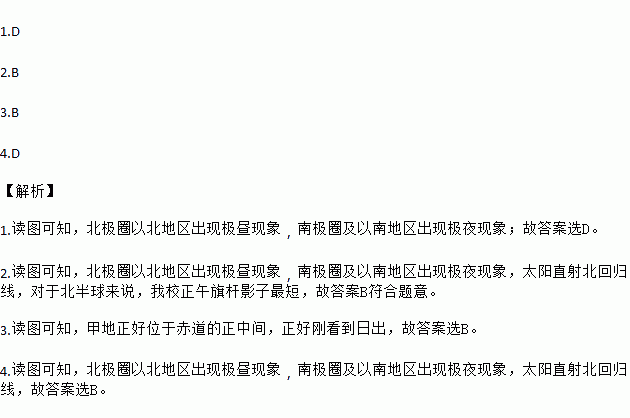 1.D 2.B 3.B 4.D 【解析】 1.读图可知,北极圈以北地区出现极昼现象,南极圈及以南地区出现极夜现象;故答案选D。 2.读图可知,北极圈以北地区出现极昼现象,南极圈及以南地区出现极夜现象,太阳直射北回归线,对于北半球来说,我校正午旗杆影子最短,故答案B符合题意。 3.读图可知,甲地正好位于赤道的正中间,正好刚看到日出,故答案选B。 4.读...