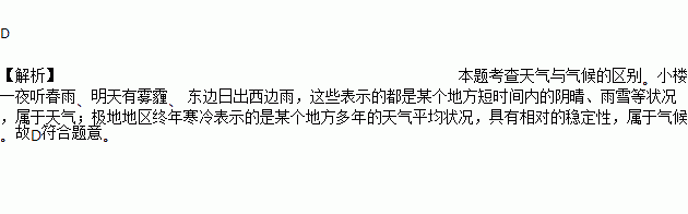 A. 小楼一夜听春雨 B. 明天有雾霾 C. 东边日出西边雨 D. 极地地区终年寒冷