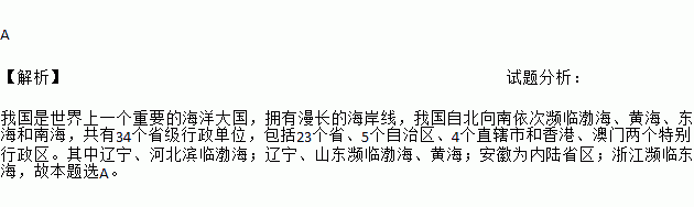 A ¡¾½âÎö¡¿ÊÔÌâ·ÖÎö£º ÎÒ¹úÊÇÊÀ½çÉÏÒ»¸öÖØÒªµÄº£Ñó´ó¹ú£¬ÓµÓÐÂþ³¤µÄº£°¶Ïߣ¬ÎÒ¹ú×Ô±±ÏòÄÏÒÀ´Î±ôÁÙ²³º£¡¢»Æº£¡¢¶«º£ºÍÄϺ££¬¹²ÓÐ34¸öÊ¡¼¶ÐÐÕþµ¥Î»£¬°üÀ¨23¸öÊ¡¡¢5¸ö×ÔÖÎÇø¡¢4¸öֱϽÊкÍÏã¸Û¡¢°ÄÃÅÁ½¸öÌØ±ðÐÐÕþÇø¡£ÆäÖÐÁÉÄþ¡¢ºÓ±±±õÁÙ²³º££»ÁÉÄþ¡¢É½¶«±ôÁÙ²³º£¡¢»Æº££»°²»ÕΪÄÚÂ½Ê¡Çø£»Õã½±ôÁÙ¶«º££¬¹Ê±¾ÌâÑ¡A¡£