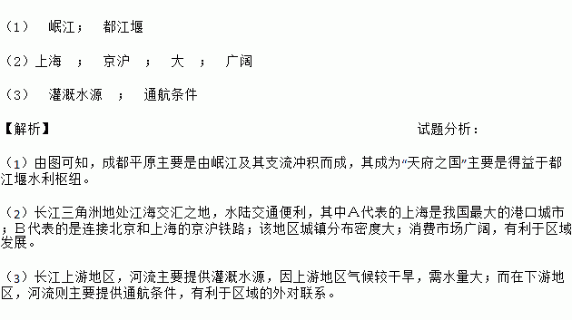 (1)岷江;都江堰 (2)上海;京沪;大;广阔 (3)灌溉水源;通航条件 【解析】试题分析: (1)由图可知,成都平原主要是由岷江及其支流冲积而成,其成为“天府之国”主要是得益于都江堰水利枢纽。 (2)长江三角洲地处江海交汇之地,水陆交通便利,其中A代表的上海是我国最大的港口城市;B代表的是连接北京和上海的京沪铁路;该地区城镇分布密度大;消费市...