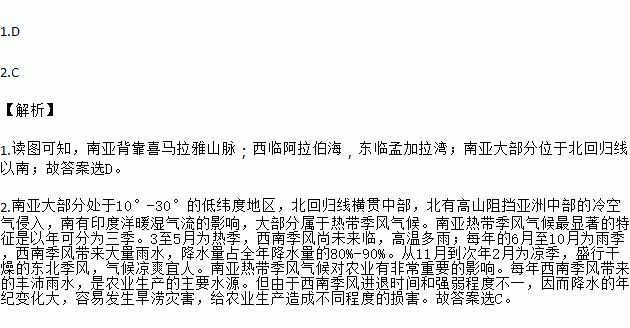 1.D 2.C 【解析】 1.读图可知,南亚背靠喜马拉雅山脉;西临阿拉伯海,东临孟加拉湾;南亚大部分位于北回归线以南;故答案选D。 2.南亚大部分处于10°-30°的低纬度地区,北回归线横贯中部,北有高山阻挡亚洲中部的冷空气侵入,南有印度洋暖湿气流的影响,大部分属于热带季风气候。南亚热带季风气候最显著的特征是以年可分为三季。3至5月为热季,西南季风尚未来临,高温多雨;每年的...