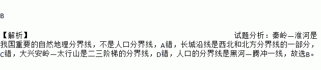B 【解析】试题分析:秦岭—淮河是我国重要的自然地理分界线,不是人口分界线,A错,长城沿线是西北和北方分界线的一部分,C错,大兴安岭—太行山是二三阶梯的分界线,D错,人口的分界线是黑河—腾冲一线,故选B。