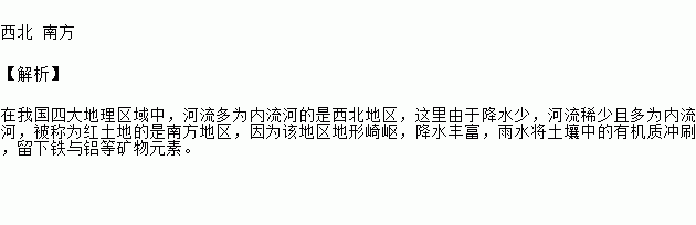在我国四大地理区域中,河流多为内流河的是_______地区;被称为红土地的是________地区。