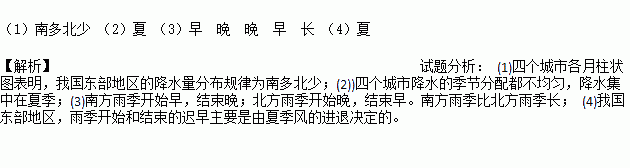 (1)四个城市各月柱状图表明,我国东部地区的降水量分布规律_________________________。