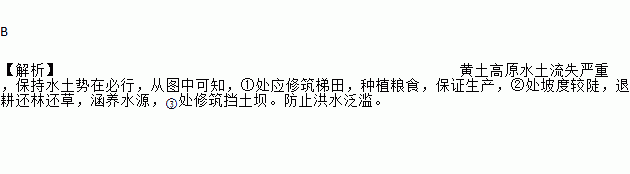 B 【解析】黄土高原水土流失严重,保持水土势在必行,从图中可知,①处应修筑梯田,种植粮食,保证生产,②处坡度较陡,退耕还林还草,涵养水源,③处修筑挡土坝。防止洪水泛滥。