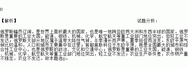 D 【解析】试题分析: 俄罗斯幅员辽阔,是世界上面积最大的国家,也是唯一地跨亚欧两大洲和东西半球的国家。俄罗斯是重要的工业大国,能源、钢铁、机械、化学、航空航天等重工业部门地位突出,但轻工业不发达;俄罗斯大部分地区属于温带大陆性气候,冬季漫长而严寒,夏季短促而凉爽。东欧平原气候比较温和,人口和城市主要集中在这里;首都莫斯科位于东欧平原,既是全国最大的城市和综合性工业中心,也是俄罗斯的政...