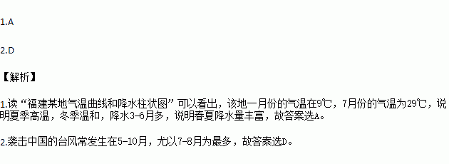 下图示意“福建某地气温曲线和降水柱状图”,回答下列各题。