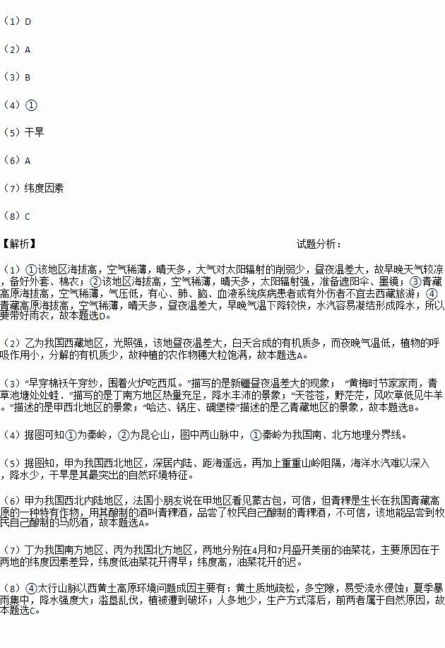 材料二:乙地区有着独特的自然和人文环境,成为旅游热点之一。某旅游团7月下旬准备到西藏地区旅游,旅行社宣传单提示:①早晚天气较凉,备好外套、棉衣 ②准备好遮阳伞、墨镜 ③带好雨衣④有心、肺、脑、血液系统疾病患者或有外伤者不宜去西藏旅游