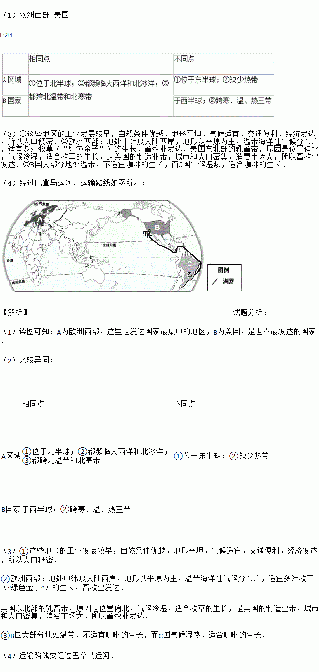 £¨1£©Å·ÖÞÎ÷²¿ ÃÀ¹ú £¨2£© £¨3£©¢ÙÕâЩµØÇøµÄ¹¤Òµ·¢Õ¹½ÏÔ磬×ÔÈ»Ìõ¼þÓÅÔ½£¬µØÐÎÆ½Ì¹£¬ÆøºòÊÊÒË£¬½»Í¨±ãÀû£¬¾¼Ã·¢´ï£¬ËùÒÔÈ˿ڳíÃÜ£®¢ÚÅ·ÖÞÎ÷²¿£ºµØ´¦ÖÐγ¶È´ó½Î÷°¶£¬µØÐÎÒÔÆ½ÔΪÖ÷£¬Î´øº£ÑóÐÔÆøºò·Ö²¼¹ã£¬ÊÊÒ˶àÖÄÁ²Ý£¨¡°ÂÌÉ«½ð×Ó¡±£©µÄÉú³¤£¬ÐóÄÁÒµ·¢´ï£®ÃÀ¹ú¶«±±²¿µÄÈéÐó´ø£¬ÔÒòÊÇλÖÃÆ«±±£¬ÆøºòÀäʪ£¬ÊʺÏÄÁ²ÝµÄÉú³¤£¬ÊÇÃÀ¹úµÄÖÆÔìÒµ´ø£¬³ÇÊкÍÈË¿ÚÃܼ¯£¬Ïû·ÑÊг¡´ó£¬ËùÒÔÐóÄÁÒµ·¢´ï£®¢ÛB¹ú´ó²¿·ÖµØ´¦...