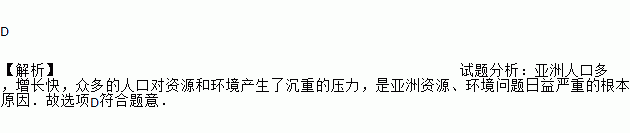 D 【解析】试题分析:亚洲人口多,增长快,众多的人口对资源和环境产生了沉重的压力,是亚洲资源、环境问题日益严重的根本原因.故选项D符合题意.