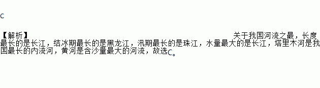 C 【解析】关于我国河流之最,长度最长的是长江,结冰期最长的是黑龙江,汛期最长的是珠江,水量最大的是长江,塔里木河是我国最长的内流河,黄河是含沙量最大的河流,故选C。