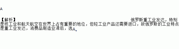A 【解析】俄罗斯重工业发达,特别是核工业和航天航空在世界上占有重要的地位,但轻工业产品还需要进口,故俄罗斯的工业特点是重工业发达,消费品制造业滞后,选A。