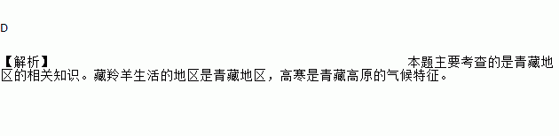 D 【解析】本题主要考查的是青藏地区的相关知识。藏羚羊生活的地区是青藏地区,高寒是青藏高原的气候特征。