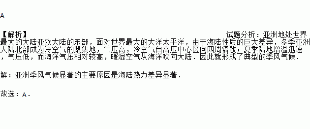 A ¡¾½âÎö¡¿ÊÔÌâ·ÖÎö£ºÑÇÖ޵ش¦ÊÀ½ç×î´óµÄ´ó½ÑÇÅ·´ó½µÄ¶«²¿£¬Ãæ¶ÔÊÀ½ç×î´óµÄ´óÑó̫ƽÑó£¬ÓÉÓÚº£Â½ÐÔÖʵľ޴ó²îÒ죬¶¬¼¾ÑÇÖÞ´ó½±±²¿³ÉΪÀä¿ÕÆøµÄ¾Û¼¯µØ£¬ÆøÑ¹¸ß£¬Àä¿ÕÆø×Ô¸ßѹÖÐÐÄÇøÏòËÄÖÜ·øÉ¢£»Ïļ¾Â½µØÔöÎÂѸËÙ£¬ÆøÑ¹µÍ£¬¶øº£ÑóÆøÑ¹Ïà¶Ô½Ï¸ß£¬Å¯Êª¿ÕÆø´Óº£Ñó´µÏò´ó½£®Òò´Ë¾ÍÐγÉÁ˵äÐ͵ļ¾·çÆøºò£® ¡¾½âÎö¡¿ ÑÇÖÞ¼¾·çÆøºòÏÔÖøµÄÖ÷ÒªÔÒòÊǺ£Â½ÈÈÁ¦²îÒìÏÔÖø£® ¹ÊÑ¡£ºA£®
