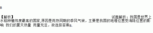 B 【解析】试题解析:我国是世界上水稻种植纬度最高的国家,原因是雨热同期的季风气候,主要是我国的地理位置受海陆位置的影响 我们的夏天热量 雨量充足,故选择答案B.