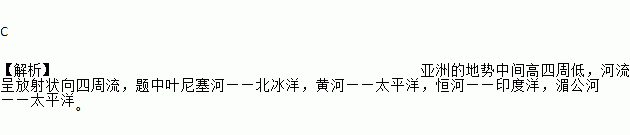 C 【解析】亚洲的地势中间高四周低,河流呈放射状向四周流,题中叶尼塞河——北冰洋,黄河——太平洋,恒河——印度洋,湄公河——太平洋。