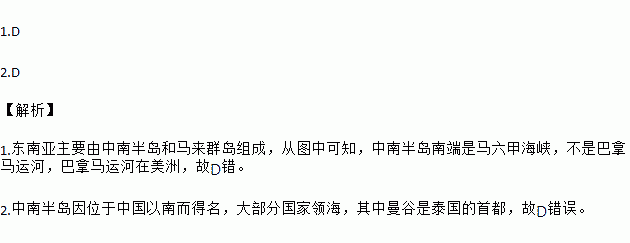 1.D 2.D 【解析】 1.东南亚主要由中南半岛和马来群岛组成,从图中可知,中南半岛南端是马六甲海峡,不是巴拿马运河,巴拿马运河在美洲,故D错。 2.中南半岛因位于中国以南而得名,大部分国家领海,其中曼谷是泰国的首都,故D错误。