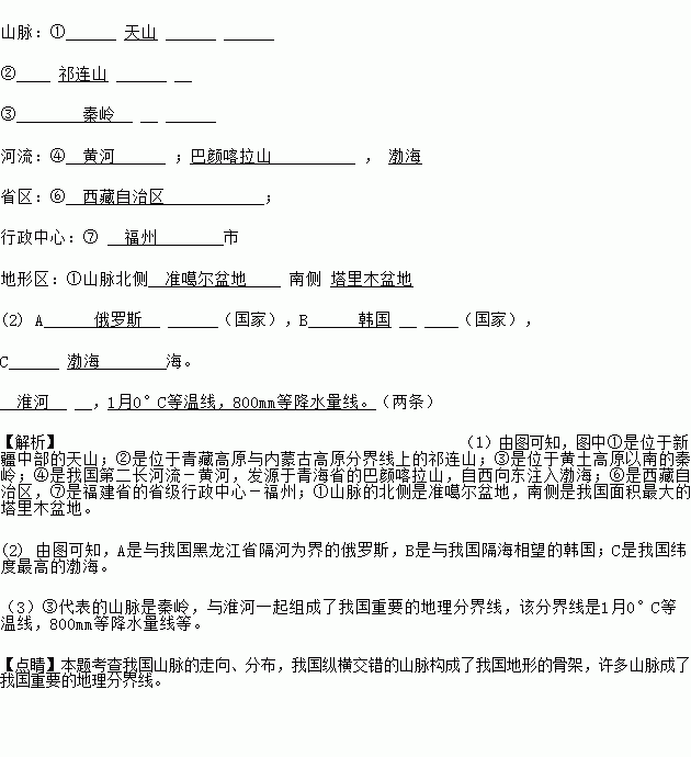(3)③山脉与 ,是一条重要的地理界线,请说出其重要的地理意义。(两条)