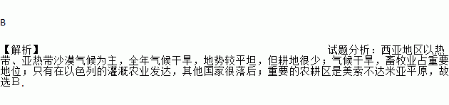 B 【解析】试题分析:西亚地区以热带、亚热带沙漠气候为主,全年气候干旱,地势较平坦,但耕地很少;气候干旱,畜牧业占重要地位;只有在以色列的灌溉农业发达,其他国家很落后;重要的农耕区是美索不达米亚平原,故选B.
