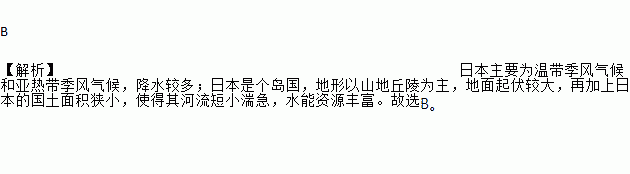 B 【解析】日本主要为温带季风气候和亚热带季风气候,降水较多;日本是个岛国,地形以山地丘陵为主,地面起伏较大,再加上日本的国土面积狭小,使得其河流短小湍急,水能资源丰富。故选B。