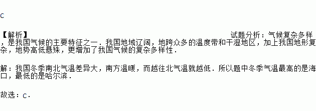 C 【解析】试题分析:气候复杂多样,是我国气候的主要特征之一.我国地域辽阔,地跨众多的温度带和干湿地区,加上我国地形复杂,地势高低悬殊,更增加了我国气候的复杂多样性. 【解析】 我国冬季南北气温差异大,南方温暖,而越往北气温就越低.所以题中冬季气温最高的是海口,最低的是哈尔滨. 故选:C.