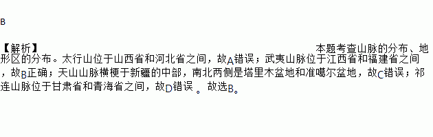 B ¡¾½âÎö¡¿±¾Ì⿼²éɽÂöµÄ·Ö²¼¡¢µØÐÎÇøµÄ·Ö²¼¡£Ì«ÐÐɽλÓÚɽÎ÷Ê¡ºÍºÓ±±Ê¡Ö®¼ä£¬¹ÊA´íÎó£»ÎäÒÄɽÂöλÓÚ½Î÷Ê¡ºÍ¸£½¨Ê¡Ö®¼ä£¬¹ÊBÕýÈ·£»ÌìɽɽÂöºá¹£ÓÚн®µÄÖв¿£¬Äϱ±Á½²àÊÇËþÀïľÅèµØºÍ×¼¸Á¶ûÅèµØ£¬¹ÊC´íÎ󣻯îÁ¬É½ÂöλÓÚ¸ÊËàÊ¡ºÍÇຣʡ֮¼ä£¬¹ÊD´íÎó ¡£¹ÊÑ¡B¡£