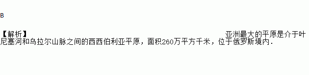 B 【解析】亚洲最大的平原是介于叶尼塞河和乌拉尔山脉之间的西西伯利亚平原,面积260万平方千米,位于俄罗斯境内.