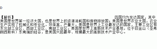 D ¡¾½âÎö¡¿ËĹú¾ùΪ·¢´ï¹ú¼Ò£¬ÆäÖÐÃÀ¹úÊÇÊÀ½çµÚÒ»¾¼Ã´ó¹ú£¬Ò²ÊÇÊÀ½çÉϵÄ×ÊÔ´ÏûºÄ¹úºÍ·ÏÎïÅŷŹú£»ÃÀ¹úÊÇÊÀ½çũҵ´ó¹ú£¬Å©ÒµÉú²úʵÏÖÁË»úе»¯ºÍרҵ»¯£¬Ð§Âʸߣ¬²úÁ¿´ó¡£ÃÀ¹úÊÇÊÀ½çÉϹ¤Òµ×î·¢´ïµÄ¹ú¼Ò£¬Ö÷Òª¹¤ÒµÇøÓж«±±²¿¹¤ÒµÇø¡¢Î÷²¿¹¤ÒµÇø¡¢Äϲ¿¹¤ÒµÇø¡£ÃÀ¹úÊÇÊÀ½çÉϸßм¼Êõ²úÒµ»ùµØ£¬Î»Óھɽðɽ£¨Ê¥¸¥ÀÊÎ÷˹¿Æ£©¶«Ä϶˵Ĺè¹È£¬ÊÇÃÀ¹úÐËÆð×îÔç¡¢¹æÄ£×î´óµÄ¸ßм¼Êõ²úÒµÖÐÐÄ¡£