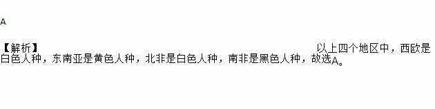 A 【解析】以上四个地区中,西欧是白色人种,东南亚是黄色人种,北非是白色人种,南非是黑色人种,故选A。
