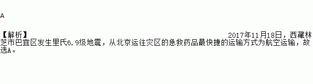 A 【解析】2017年11月18日,西藏林芝市巴宜区发生里氏6.9级地震,从北京运往灾区的急救药品最快捷的运输方式为航空运输,故选A。