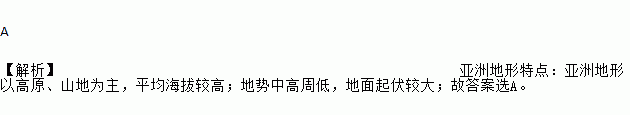A 【解析】亚洲地形特点:亚洲地形以高原、山地为主,平均海拔较高;地势中高周低,地面起伏较大;故答案选A。