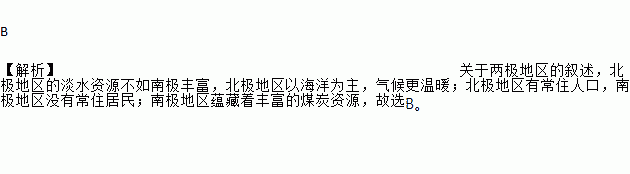 B 【解析】关于两极地区的叙述,北极地区的淡水资源不如南极丰富,北极地区以海洋为主,气候更温暖;北极地区有常住人口,南极地区没有常住居民;南极地区蕴藏着丰富的煤炭资源,故选B。