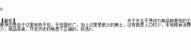 关于东北平原成为商品粮基地主要原因的叙述,不正确的是( )