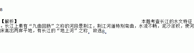 B 【解析】本题考查长江的水文特征。长江上素有“九曲回肠”之称的河段是荆江,荆江河道特别弯曲,水流不畅,泥沙淤积,使河床高出两岸平地,有长江的“地上河”之称。故选B。