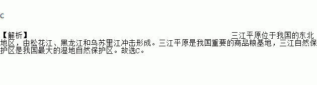 C ¡¾½âÎö¡¿Èý½Æ½ÔλÓÚÎÒ¹úµÄ¶«±±µØÇø£¬ÓÉËÉ»¨½¡¢ºÚÁú½ºÍÎÚËÕÀï½³å»÷Ðγɡ£Èý½Æ½ÔÊÇÎÒ¹úÖØÒªµÄÉÌÆ·Á¸»ùµØ£¬Èý½×ÔÈ»±£»¤ÇøÊÇÎÒ¹ú×î´óµÄʪµØ×ÔÈ»±£»¤Çø¡£¹ÊÑ¡C¡£