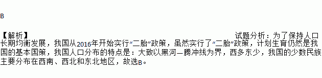 B 【解析】试题分析:为了保持人口长期均衡发展,我国从2016年开始实行“二胎”政策,虽然实行了“二胎”政策,计划生育仍然是我国的基本国策,我国人口分布的特点是:大致以黑河—腾冲线为界,西多东少,我国的少数民族主要分布在西南、西北和东北地区,故选B。