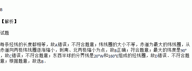B. 纬度越高,纬线越短,纬度越低,纬线越长
