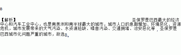 B 【解析】圣保罗是巴西最大的经济中心和汽车工业中心,也是南美洲和南半球最大的城市,城市人口的急剧增加、环境恶化、资源危机,城市发展带来的大气污染、水资源短缺、噪音污染、交通拥堵、治安恶化等,圣保罗是巴西城市化问题严重的城市,故选B。