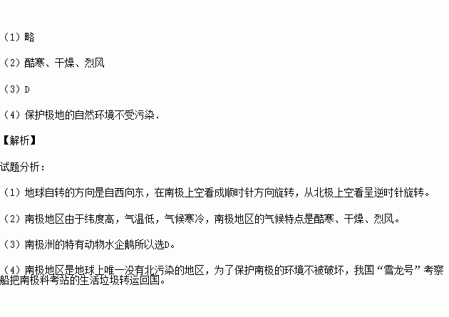 (1)在“南极地区和北极地区图”的弧线①和②上画出箭头表示地球自转的方向。