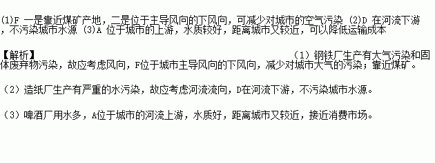 某城镇规划要建钢铁厂、造纸厂、啤酒厂,请在图中ABCDEF处合理安排,并说明理由。