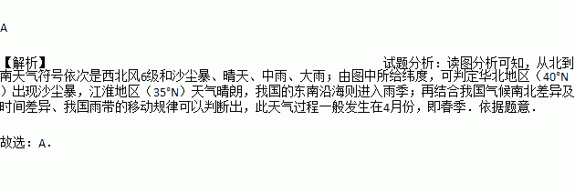 下图为沿我国东部一条经线附近地区的天气状况示意图,此天气过程一般发生在