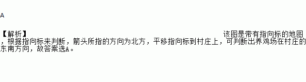 A 【解析】该图是带有指向标的地图,根据指向标来判断,箭头所指的方向为北方,平移指向标到村庄上,可判断出养鸡场在村庄的东南方向,故答案选A。