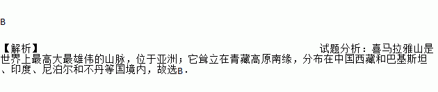 B 【解析】试题分析:喜马拉雅山是世界上最高大最雄伟的山脉,位于亚洲;它耸立在青藏高原南缘,分布在中国西藏和巴基斯坦、印度、尼泊尔和不丹等国境内,故选B.