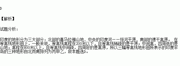 下列三幅等高线地形图所表示的三种地形,在印度半岛自北而南排列为( )