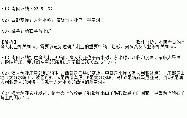 (1)南回归线(23.5°S) (2)西部高原;大分水岭;塔斯马尼亚岛;墨累河 (3)绵羊;骑在羊背上的 【解析】整体分析:本题考查的是澳大利亚相关知识,需要识记穿过澳大利亚的重要纬线、地形、河流以及农业等相关知识。 (1)南回归线穿过澳大利亚中部,澳大利亚位于南半球、东半球,西临印度洋,东临太平洋,读图可知:穿过如图中部的纬线是南回归线(23.5°S)。 (2)澳大...