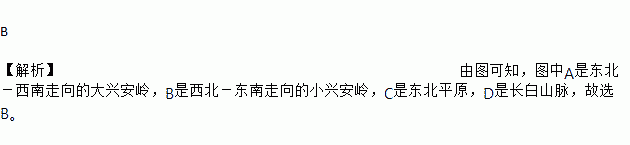 B 【解析】由图可知,图中A是东北-西南走向的大兴安岭,B是西北-东南走向的小兴安岭,C是东北平原,D是长白山脉,故选B。